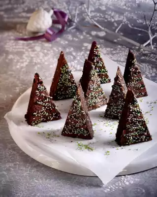 Take out the cake and let it cool down. Cut the cake into about 50 triangles. Chop 50 g chocolate and melt over a warm water bath. Put the chocolate in a piping bag with a small perforated spout and distribute in strips over the triangles.