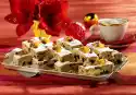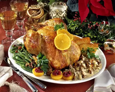 Bind the stock with it, bring to the boil and refine with cream. Let simmer for about 5 minutes. Add mushrooms and season to taste. Fill apricots with cranberries. Arrange turkey with mushrooms, beans and apricots. Crumble the roasted bacon from the turkey and sprinkle over the beans. Garnish with parsley and orange slices
