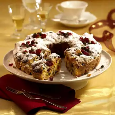 Grease a springform pan (26 cm Ø) with a tube bottom insert. Roll the dough into a long strand (approx. 46 cm long), place in the form and press down. Cut the surface in a zigzag pattern. Cover and let rest for another 1 hour. Bake in the preheated oven (electric cooker: 200 °C/ convection oven: 175 °C/ gas: level 3) for approx. 15 minutes. Reduce the oven temperature (electric oven: 175 °C/ convection oven: 150 °C/ gas: level 2) and bake for another 50-60 minutes. If necessary, cover after half the baking time. Melt 150 g butter. Take out the cake, remove the edge of the springform pan. Brush immediately with half of the butter. Dust with half of the powdered sugar. Repeat the process once more with butter and icing sugar. Let it cool down, then carefully remove from the mould. Mix 2 tablespoons of cranberries and pistachios with jam and decorate the wreath with it