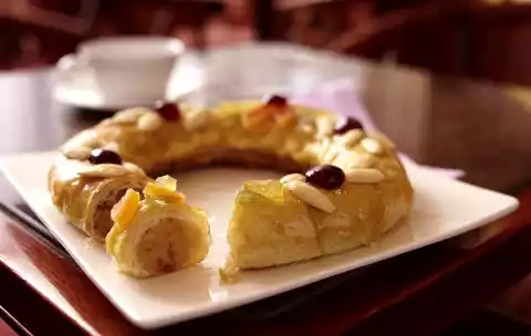 Halve the almonds lengthwise. Halve 3 cherries. Warm the jam and spread it on the wreath. Decorate immediately with almonds, cherries and candied fruit.