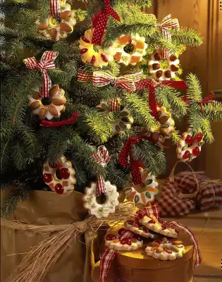 Also halve the cherries or cut them into slices. Cut apricots into slices, cubes or quarters as desired. Cut pineapple into sticks. Put icing sugar, lemon juice and egg white in a mixing cup and mix well with the whisk of the hand mixer for about 1 minute. Spread the wreaths with it and decorate with the prepared fruits and nuts and the ground pistachios. Leave to dry well and hang up with bows to decorate, for example, a fir tree. Results in about 36 pieces