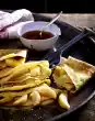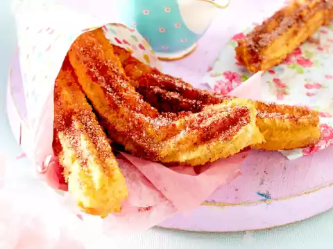 Remove with a skimmer and drain well on kitchen paper. Mix 150 g sugar and 1 tablespoon cocoa powder. Turn churros in cocoa sugar. Serve with chocolate sauce.
