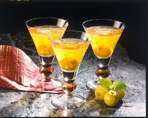 Put the cherry apple in a glass and pour the Calvados over it. Fill up with well chilled cider