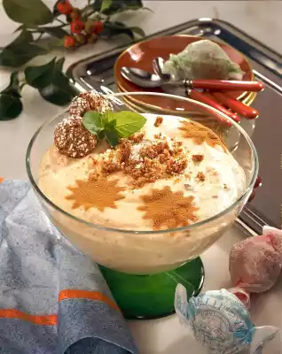 Squeeze out the gelatine and dissolve at low heat. Stir into the egg liqueur mixture, chill and allow to thicken slightly. Fold in cream, beaten egg white and Amarettini (keep approx. 20 g). Pour the cream into a bowl and let it cool in the fridge for about 2 hours. Use a stencil to dust cinnamon stars on the surface. Decorate with crumbled amarettini and possibly lemon balm leaves