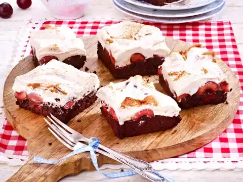 Remove from the oven, place on a kitchen grid and allow to cool. Mix 3 sachets of vanilla sugar, cinnamon and cream thickener. Whip the cream and finally pour in the sugar mixture. Spread the rest of the cherries on the base and spread the cinnamon cream loosely on top.