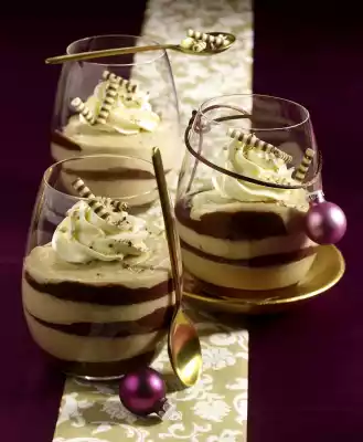 Soak gelatine in cold water. Chop both types of couverture and melt them separately over a warm water bath. Beat the egg yolks and sugar over a warm water bath until thick and creamy. Squeeze the gelatine and dissolve in the warm cream. Halve the cream. Stir in one half cinnamon and white chocolate coating. Stir dark chocolate coating under the other half. Whip 400 g cream until stiff. Fold about 2/3 into the dark cream. Fold the remaining cream into the light cream. Layer both creams alternately in 4-6 glasses. Chill for about 2 hours. Whip 100 g cream until stiff. Pour into a piping bag with a large star-shaped spout. Pour tuffs into the glasses. Decorate with chocolate rolls