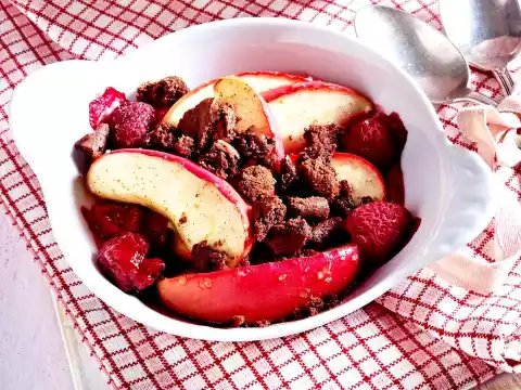Divide the apple slices into 4 greased, ovenproof moulds (each approx. 12 cm Ø). Spread raspberries on top. Bake in the preheated oven (electric cooker: 200 °C/ convection oven: 175 °C/ gas: see manufacturer) for about 20 minutes.