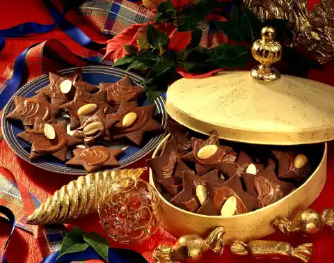 Roll out the dough thinly on a floured work surface and cut out stars of different sizes (from 5-8 cm Ø). Spread on 2-3 baking trays lined with baking paper. Bake one after the other in a preheated oven (electric: 175 °C/ gas: level 2) for 8-10 minutes. Let them cool down. In the meantime, chop the chocolate coating and melt it on a hot water bath, then let it cool down again and put on a little. Then decorate each star with a brush stroke of couverture. Put half an almond on top