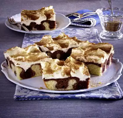 Whip 250 g cream with the whisk of the hand mixer until stiff, adding 50 g sugar. Stir the sour cream and 4 tablespoons of cream until smooth. Soak the gelatine in cold water, squeeze it out and dissolve it in a pot at low heat. Stir in 3 tbsp. sour cream. Stir into the remaining sour cream. Fold cream into the sour cream and spread on the cake. Make waves with a damp, hot tablespoon. Mix cinnamon and 5 tbsp. sugar, sprinkle on the cake, cut into pieces