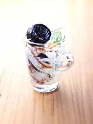 Pour the curd into jars, place one prune on each wooden skewer and garnish the curd with it. Serve sprinkled with some mint leaves.