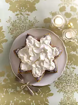 Separate eggs. Sift the icing sugar. Beat 3 egg whites with the whisks of the hand mixer until stiff. Stir in icing sugar by the spoonful. Stir in almonds, vanillin sugar, cinnamon and bitter almond flavour. Line a baking tray with baking paper, place a star-shaped baking frame (28 cm Ø) on top. Fold the baking paper upwards around the baking frame. Spread the dough in the baking frame