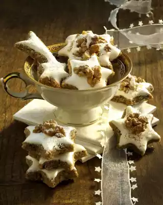 Line two baking trays with baking paper. Sieve 250 g icing sugar. Beat the egg whites and 1 pinch of salt until stiff with the whisks of the mixer, gradually adding icing sugar. To coat the stars, fill 6-8 tbsp. of beaten egg white into the freezer bag.