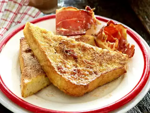 Fry bacon in a pan without fat in portions until crisp. Remove. Heat the butter in the pan in portions and fry the slices of bread in it for about 5 minutes on each side.