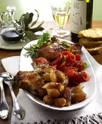 Arrange chops with onions and tomatoes in balsamic vinegar on a deep plate. Serve garnished with rosemary, sage and basil.