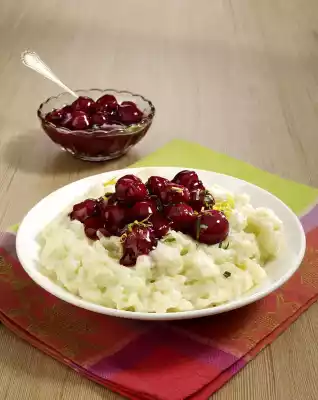 Bring milk, salt, honey and lemon peel to the boil. Stir in rice pudding and let it swell at low heat for about 40 minutes, stirring occasionally. Meanwhile drain the cherries, collecting the juice. Bring the juice to the boil, except for 4 tablespoons.