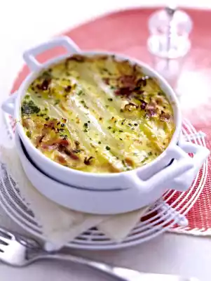 2 Preheat the oven to 180 °C (th 6). Brown the leek 5 minutes in a pan with the butter. Salt and pepper. Cut the ham into small pieces, add it and mix 2 minutes. Divide into 4 small oven dishes (or a large one). Arrange the asparagus on top