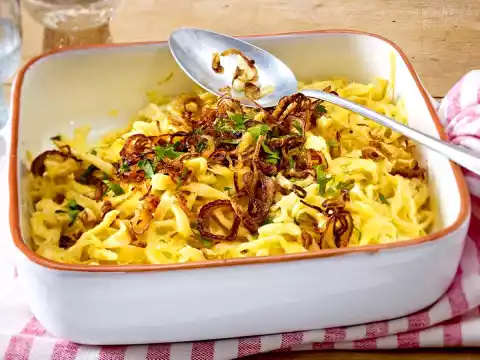 Mix the spaetzle and cheese and place in a greased casserole dish. Bake in a preheated oven (electric cooker: 200 °C/ convection oven: 175 °C/ gas: see manufacturer) for 10-15 minutes. Peel onions, cut them into thin rings and turn them in 1 tbsp. flour. Tap off excess flour. Heat butter in a pan. Fry the onions until golden brown. Wash and roughly chop the parsley. Remove the spaetzle from the oven and spread onion rings on top. Sprinkle with parsley