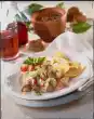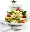 Pour the rest of the béchamel sauce on top. Wash, clean and seed the tomato. Cut the flesh into pieces and sprinkle over the béchamel sauce. Sprinkle with parmesan. Bake in the preheated oven (electric cooker: 200 °C/ convection oven: 175 °C/ gas: level 3) for about 40 minutes until golden brown. Garnish with basil