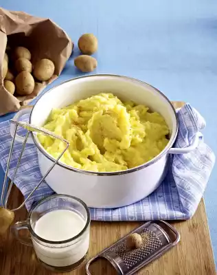 Warm up the milk. Drain potatoes. Add butter, warm milk and some nutmeg and mash. Season mashed potatoes with salt