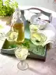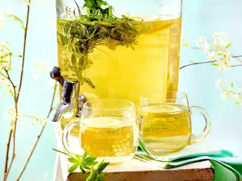Put white wine in a container and hang the woodruff upside down. It is important that the stem ends remain above the surface of the wine, otherwise the Maibowle will become bitter. Chill for about 1 hour and let it steep.