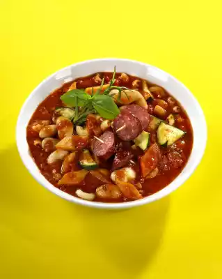 Deglaze with tomatoes and stock, bring to the boil. Season with salt, pepper, paprika and sugar. Cover and simmer at low heat for about 10 minutes. Pour pasta into a sieve, quench and drain. Put Cabanossi on wooden skewers. Season soup again with salt, pepper, sugar and paprika. Add noodles and beans and warm up. Serve the soup with cabanossi skewers and garnish with rosemary and basil as desired