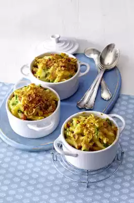 Grease ovenproof moulds. Mix the pasta with about half of the cheese sauce and distribute into the ramekins. Pour the rest of the sauce over the pasta. Put the cornflakes in a freezer bag, crumble them coarsely and pour over