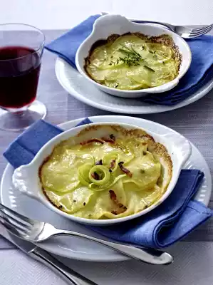 Spread 2 small gratin dishes with butter. Put half of the potatoes into the casseroles. Spread the bacon and leek on top, except for something to sprinkle. Season with salt, pepper and pimento.
