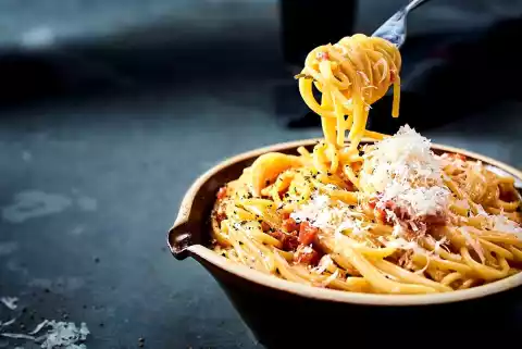 Add the pasta to the boiling salted water and cook according to the instructions on the packet. Heat the oil in a large coated pan. Brown the pancetta in it, fry the garlic briefly. Drain the noodles and collect approx. 4 tbsp. cooking water. Add the noodles to the pancetta and mix well.