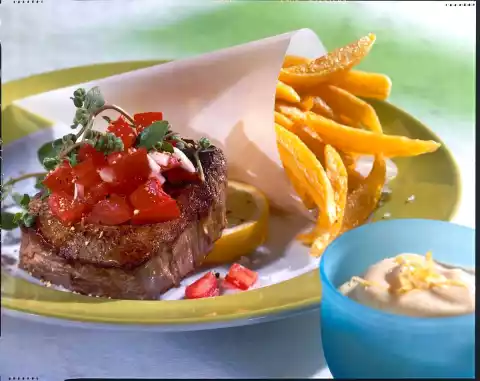 Put potato pegs into the hot fat and deep-fry. Let it drip off on kitchen paper. Place in a bowl and salt. Arrange steaks on plates. Add tomatoes and serve garnished with oregano.