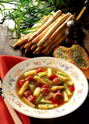 Peel the asparagus, cut the ends off thinly and cut the asparagus into pieces. Clean the kohlrabi and cut into sticks. Cook the asparagus and kohlrabi in the broth for about 15 minutes. Press the meat out of the skin, heat the oil in a pan and fry the meatballs in it until golden brown. Drain the tomatoes and cut into pieces.