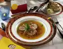 Cover the mould in a pot in a bain-marie and let it simmer at low heat for about 30 minutes. Clean and wash the mushrooms and cut them into fine slices. Bring beef stock to the boil. Turn out the eggs from the mould and cut into small cubes.