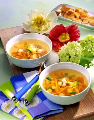 Add soup vegetables, mushrooms and tomatoes, fry briefly. Season with salt and pepper. Add 1 litre of water and bring to the boil. Let simmer for about 45 minutes. Peel carrots and cut them into thin sticks. Peel kohlrabi and dice finely. Wash the rest of the leek and cut into rings. Sieve broth and bring to the boil. Cook vegetables in the stock for 5-10 minutes. Dice toast and roast in remaining oil.