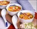 Add stock, bring to the boil and cook for about 3 minutes. Cut turkey meat into fine strips. Drain the rice and add it to the broth together with the turkey. Season to taste with salt and pepper
