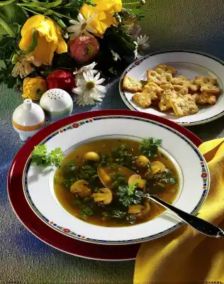 Clean and wash the mushrooms and, depending on the size, halve or quarter them. Peel and finely dice the onion. Fry in hot oil. Add mushrooms and fry lightly. Add peas, pour in broth, bring to the boil and cook over a mild heat for 10 minutes.