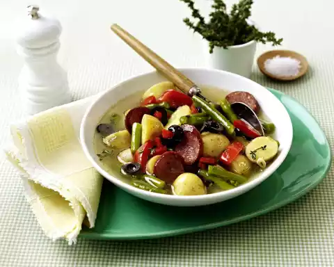 Heat the oil in a pot. Lightly fry the cabanossi and potatoes for about 5 minutes. After about 3 minutes add beans, garlic and paprika. Deglaze with broth and simmer covered for about 30 minutes