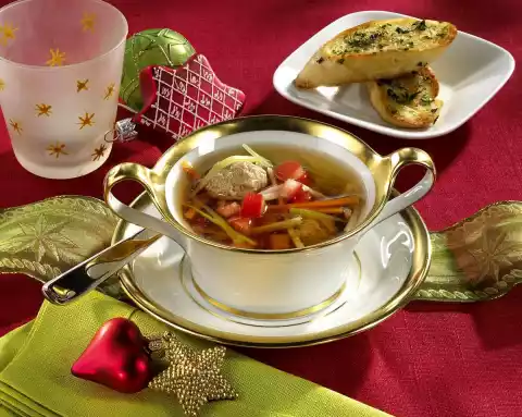 Clean and wash the soup greens and cut them into fine sticks. Peel and finely chop the onion. Knead minced meat, egg, breadcrumbs, onion, some salt and pepper. Form small dumplings from the mixture with moistened hands.