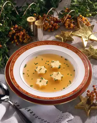 Wash the chives and cut into fine rings. Turn the eggs over onto a board. Cut out stars with a cookie cutter. Spread broth and egg stab on 4 soup plates. Sprinkle with chives