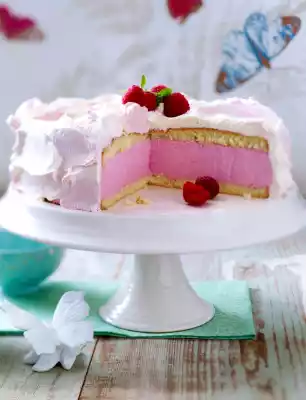 Remove the sponge cake from the mould and cut in half horizontally. Place a cake ring around the lower cake base. Soak the gelatine. Puree the raspberries, pass through a fine sieve and chill 2-3 tbsp. raspberry puree.