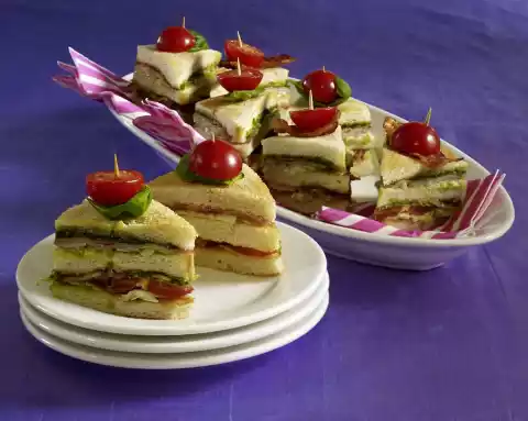 Spread the toast with the rest of the salad, cover with 4 slices of turkey breast and spread with 1 tsp of pesto. Finish with a slice of toast. Wash the basil and dab dry. Fix the sandwich with 4 wooden skewers each.