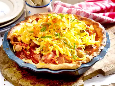 For the shortcrust pastry base, dice 125 g cold butter. Knead egg, butter, 250 g flour and 4-6 tbsp. cold water to a smooth dough. Roll out round (approx. 32 cm Ø) on a floured work surface and place in a greased casserole dish (approx. 26 cm Ø).