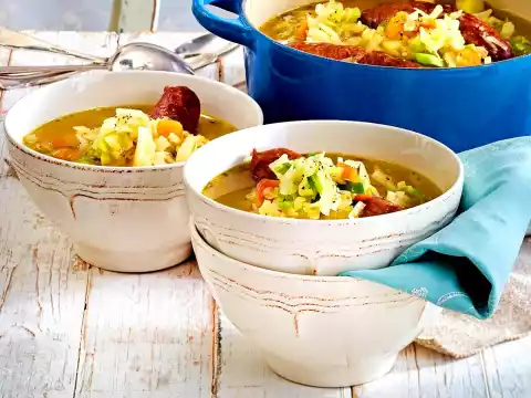 Clean the leek, cut the upper third and wash. Cut leek into rings. Add leek and cabbage sausage to the pot about 15 minutes before the end of the cooking time. Season the stew with salt, pepper and some caraway seeds and serve