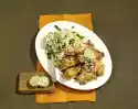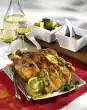Wash the chicken and put it in a pot. Pour about three litres of water so that the chicken is covered. Add two teaspoons of salt, laurel, parsley, thyme and bacon. Bring everything to the boil and simmer in the open pot for 1 1/2 hours.