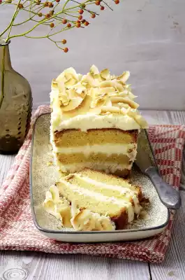 Roast the coconut chips in a pan without fat until golden brown. Cut the cake horizontally into 3 slices. Place the bottom cake layer on a cake plate and spread with about 1/3 of the coconut mixture. Place the middle cake layer on top and sprinkle with the coconut mixture.
