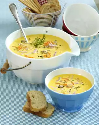 Heat the fat in a saucepan. Sauté onion, garlic and ginger in it. Steam the carrots briefly. Season with salt, pepper and some sugar. Dust with flour and turmeric and sauté briefly. Good 3⁄4 Stir in l water, coconut milk and broth, bring to the boil.