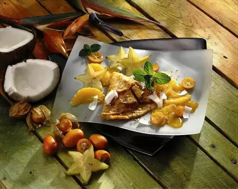 Peel the rest of the orange so that the white skin is completely removed. Use a sharp knife to cut out the flesh between the parting skins. Wash and slice the kumquats and carambola. Roast half of the grated coconut. Fold the remaining grated coconut into the crépe dough. Bake 8 crêpes one after the other in hot fat and keep warm. Serve with the fruits and sauce, sprinkle coconut on top and decorate
