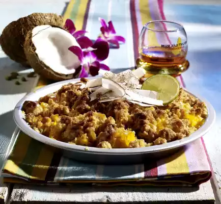 Grease a pie mould (approx. 24 cm Ø) well and put the mangos into the mould. Spread crumbles over it. Bake in the preheated oven (electric cooker: 200 °C/ convection oven: 175 °C/ gas: level 3) for about 30 minutes until crispy brown.