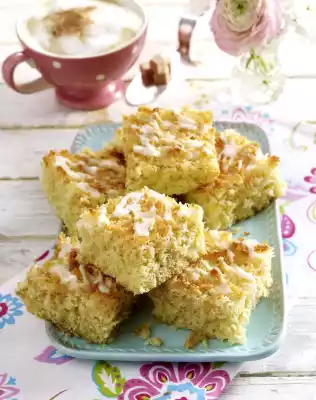 Melt butter for the topping. Add 1/2 can of sugar (just under 200 g) and about 8 tbsp. cold water. Stir well, then stir in grated coconut. Spread the mixture evenly on the hot cake and bake for another 10-15 minutes at the same temperature until golden brown.