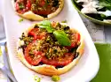 Pour the cream into four dessert glasses. Place the glaze bottle in hot water for about 10 minutes. Spray glaze spirally onto the cream. Decorate with mint and chocolate sticks