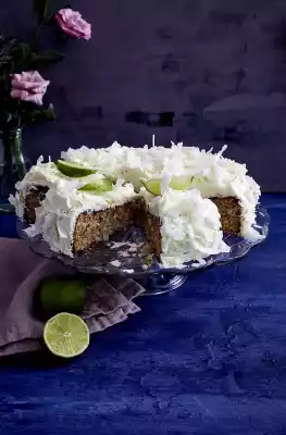 Coat the cooled cake all around with the Frosting, sprinkle with coconut flakes and decorate with lime wedges.