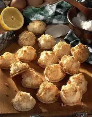 Heat sugar, 100 g grated coconut and egg white in a pot to approx. 50°C while stirring constantly. Remove the pot from the stove. Stir in lemon zest and remaining grated coconut. Spread the wafers on a damp baking tray and use 2 teaspoons of a little coconut mass as a heap on the wafers. Bake in a preheated oven (electric: 175 °C/ gas: level 2) for about 20 minutes. Results in about 40 pieces